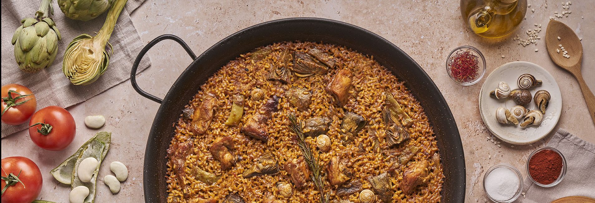 En nuestros talleres podrás elegir entre tres modalidades de paella: Paella Valenciana, Paella de Marisco y Paella Vegana.